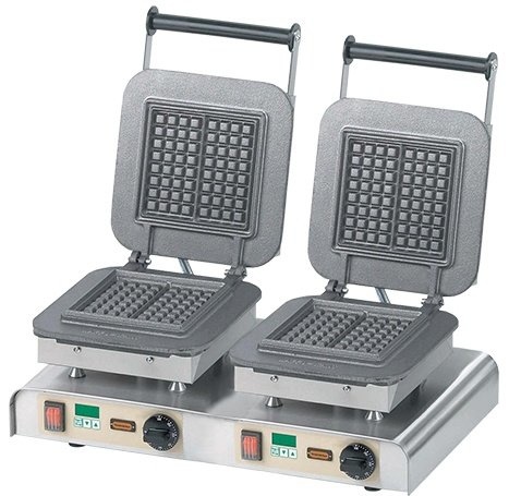 type double, livrable avec un seul ou plusieurs jeux de plaques en fonte pour préparer gaufres, crêpes et poffertjes, les jeux de plaques sont échangeables aisément, avec thermostat, interrupteur marche-arrêt et minuterie électronique avec signal acoustique