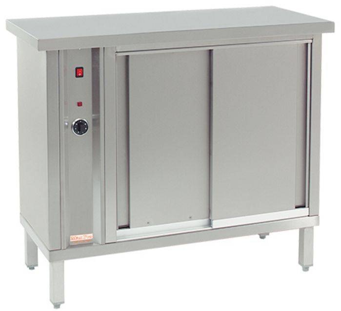 inox 18/8, au moyen du ventilateur encastré la chaleur est diffusée également, mise en forme compacte et robuste, avec thermostat, voyant de contrôle et portes coulissantes à rouelles, capacité 120 assiettes max. Ø32cm