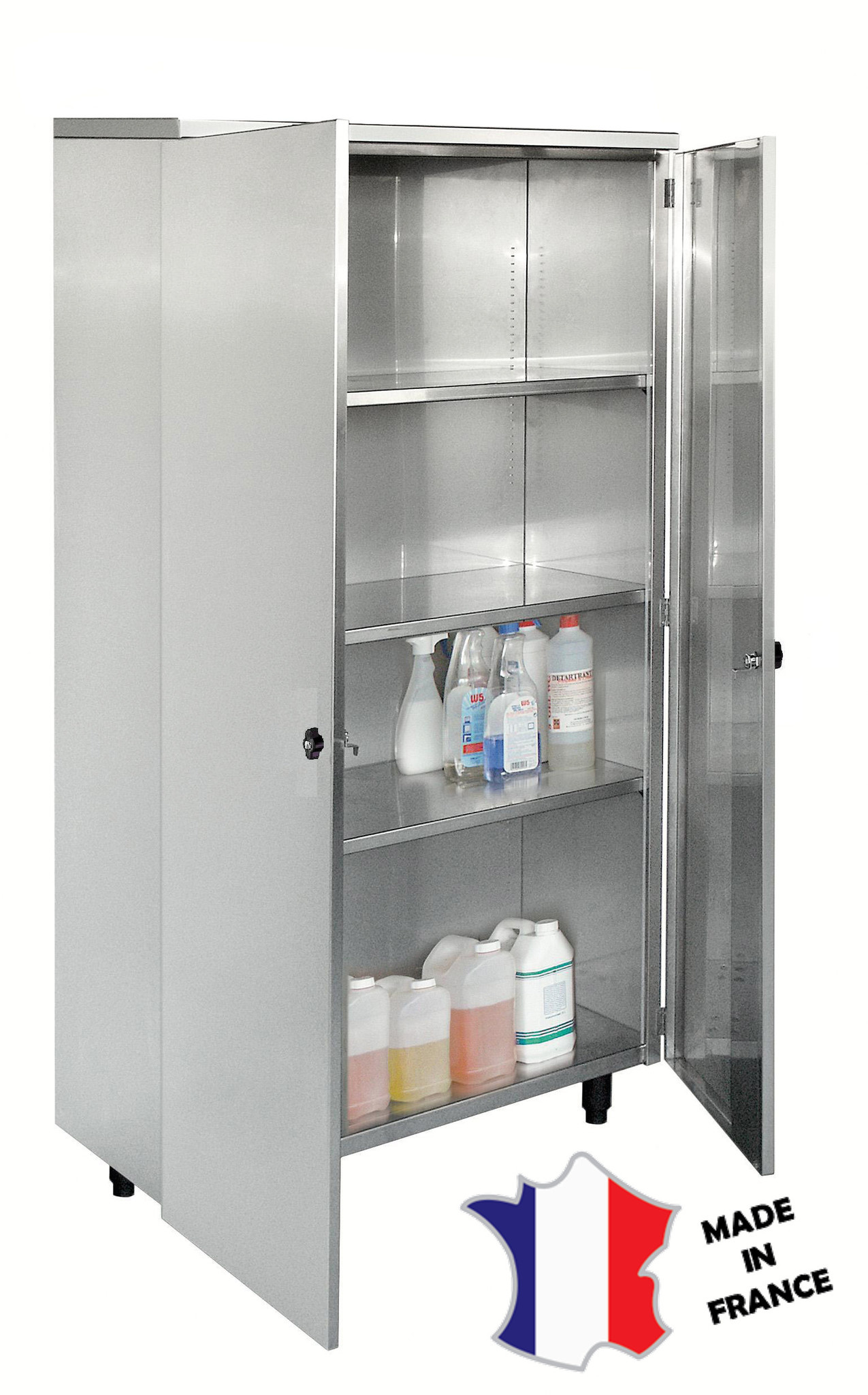 Armoire haute tout inox 441,Dim: 1000x475Xht1805mm.2 portes battantes doublées. 3 étagères avec plis écrasés - 1 serrure + 1 poignée par porte.