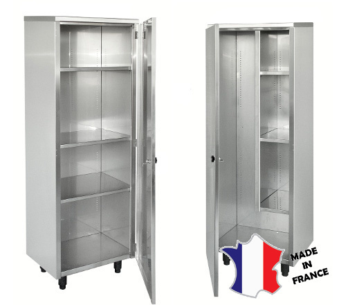 Armoire haute tout inox 441Dim:1200x600xht1805 mm. 2 portes battantes doublées. 3 étagères - serrures+poignées.