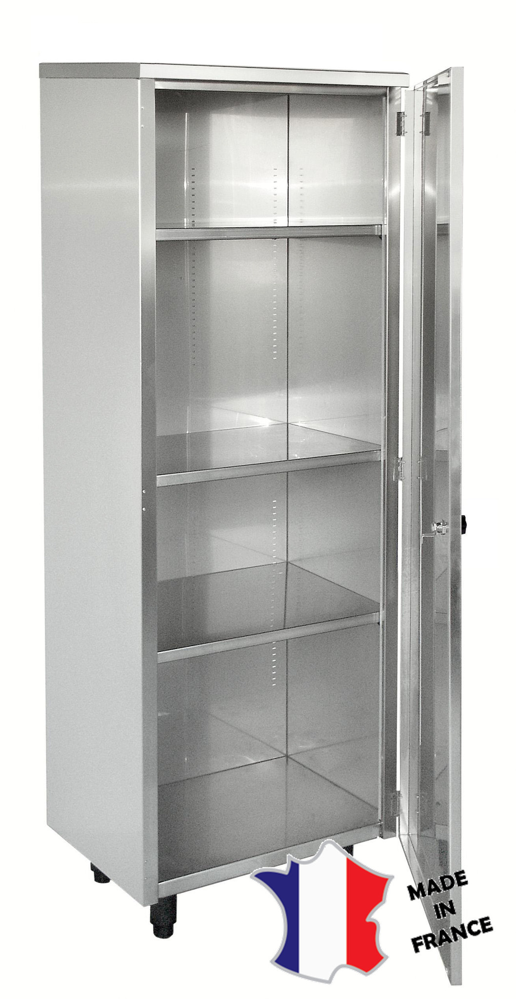 Armoire haute tout inox 441, Dim: 600x475Xht1805 mm.1 porte battante doublée. 3 étagères avec plis écrasés - serrure+poignée.