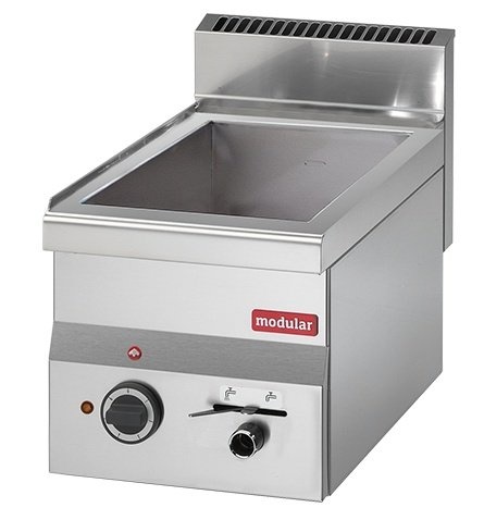 électrique, pour bacs gastronorme avec profondeur jusqu'a 15cm, à double paroi, robinet et tuyau de vidage encastrés, filtre égouttoir en inox perforé au-dessus de sole plate avec résistance encastrée, thermostat à opération continue avec commutateur marche-arrêt et voyant de contrôle