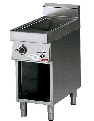 électrique, pour des bacs 1 x 1/1GN avec profondeur jusqu'à 15cm, a double paroi, robinet et tuyau de vidange encastrés, filtre égouttoir en inox perforé au-dessus de la sole plate avec résistance encastrée, thermostat à opération continue avec commutateur marche-arrêt et voyant de contrôle