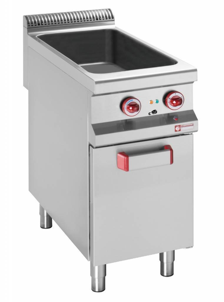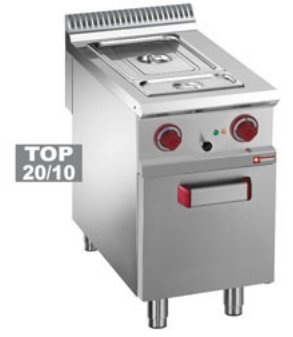 - Cheminée arrière en acier inox AISI 304. Cuve "emboutie" en acier inox AISI 304 soudée (en continu), avec tous les coins et angles intérieurs arrondis pour un entretien facile et hygiénique, un robinet de vidange (à bille) est placé sur la face avant de l'appareil. Chauffage électrique par résistances blindées en acier inox, placées en dessous du fond de la cuve, à l'extérieur. Régulation de 30°C à 90°C, accessibilité frontale permettant une maintenance très aisée.