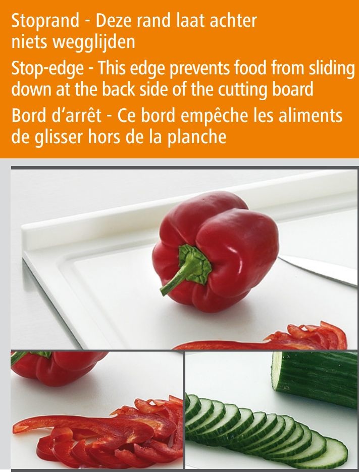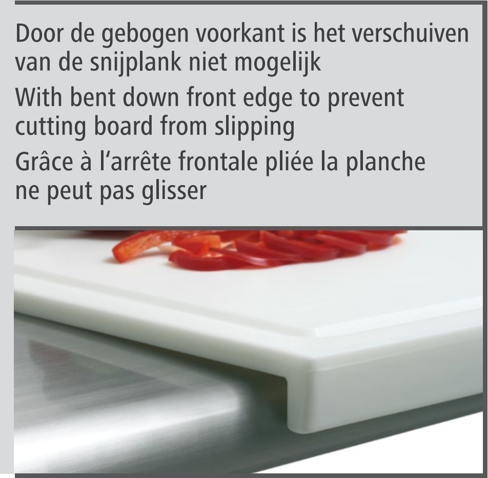 Grâce au bord antérieur recourbé, la planche à découper ne risque pas de glisser. Convient aux aliments et à un usage professionnel continu.