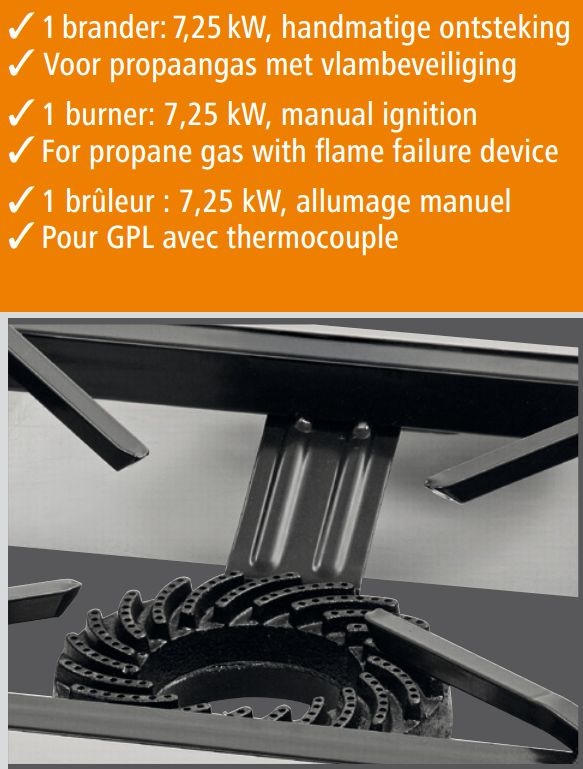 1 brûleur : 7,25 kW, allumage manuel