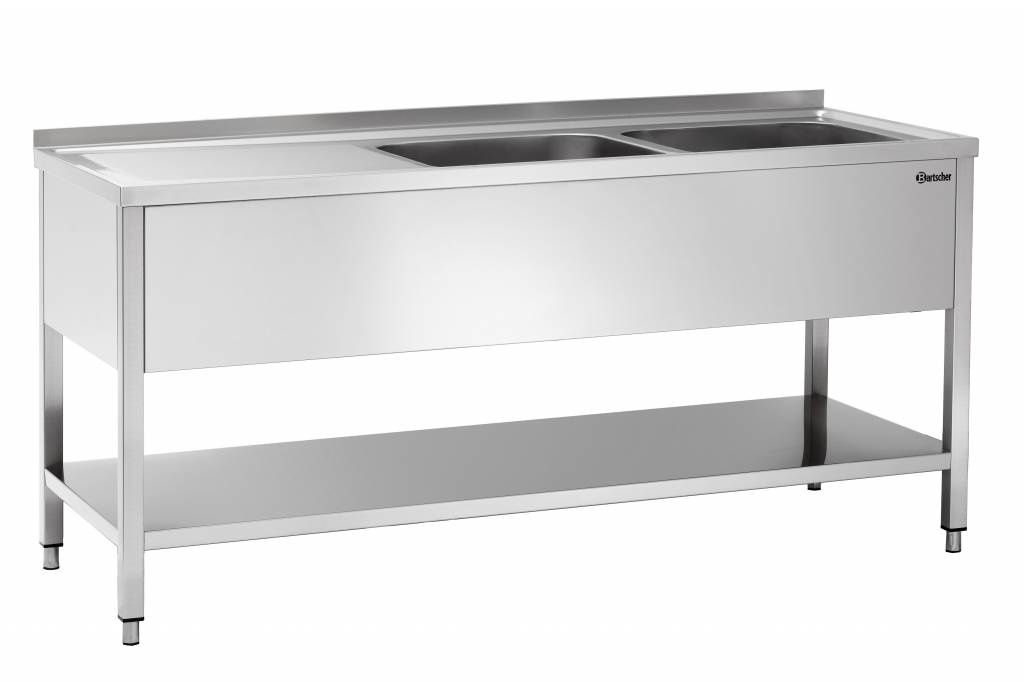 Table de Prélavage Inox Poli LUXE - 2 Bacs 500x500x250(h)mm - Égouttoir à Droite - 1800x700x850-900(h)mm