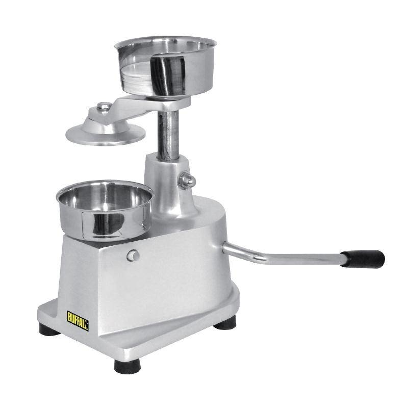 Machine à steaks hachés manuelle en alliage d'aluminium. Facile à nettoyer, elle permet de fabriquer des steaks hachés de taille et de forme uniformes. Pour la fabrication artisanale. Le support d'alimentation supérieur contient des ronds de papier sulfurisé (non fournis) pour séparer les steaks de manière pratique.