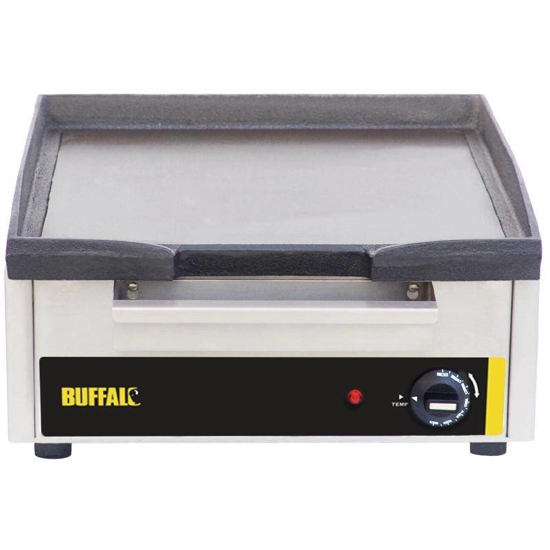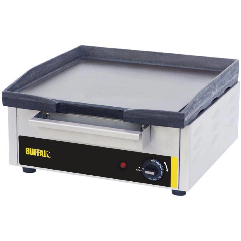 Plaque de cuisson professionnelle à thermostat réglable et récipient à graisse amovible.