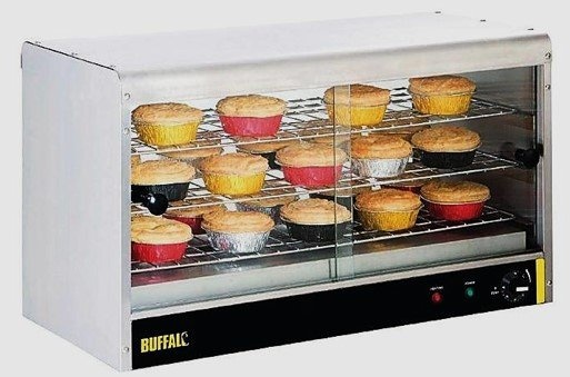 Vitrine chauffante de comptoir en acier inoxydable, hygiénique et facile à nettoyer grâce aux portes en verre coulissantes. Eclairage intérieur et bac à eau pour l'humidification permettant aux aliments de ne pas se dessécher. 3 étagères amovibles.