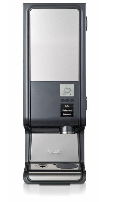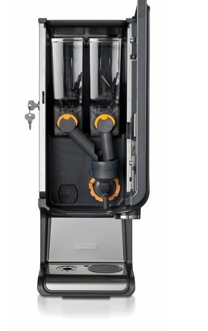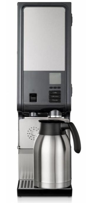 Équipé de deux bidons pour le dosage du café, du cappuccino ou du chocolat et d'un drain séparé pour eau chaude, par exemple du thé ou de la soupe. Pour les emplacements avec une demande de pointe pour des volumes plus importants et un raccordement à l'eau. En outre, la machine est équipée d'une commande numérique, d'un bac collecteur en plastique, d'un signal de détartrage automatique et d'un programme de rinçage.