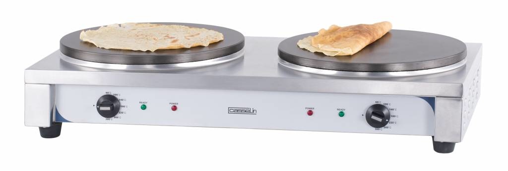 Un crêpière double en acier inoxydable de la marque Casselin. Les plaques en fonte ont une diamètre de Ø400mm, ce qui est parfaite pour une utilisation professionnelle!