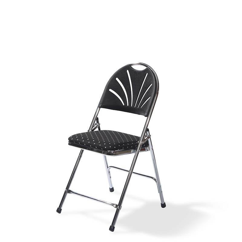 La chaise pliante Deluxe est réalisée avec un confortable siège en tissu (retardeur de flammes) avec des motifs en blanc. Son dossier est rond et en plastique noir et le cadre du tuyau du piétement est chromé et de Ø 22cm. Pour cette chaise aussi, un chariot adapté est disponible.