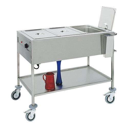 à double paroi, inox, avec compartiments GN chauffées séparément, propre aux bacs GN d'une profondeur jusqu'à 20cm, avec poignée, 4 roues, deux avec frein à pied, tampons en caoutchouc, robinet de vidange, thermostat, témoin lumineux, livrée sans bacs GN