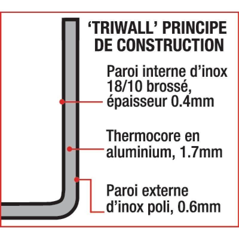 - Couche centrale en aluminium 'thermocore', extérieur en inox pour une répartition de la chaleur homogène.