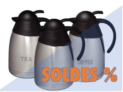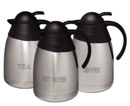 set de 3 Pichets isotherme de 1,5 litres avec une étiquette Tea, coffee et hot water. Double paroi en acier inoxydable permettant une excellente rétention de la chaleur.