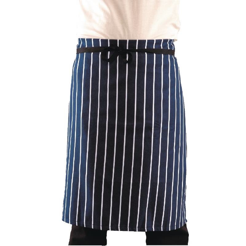 Tablier rayé traditionnel marine et blanc, longueur standard.
