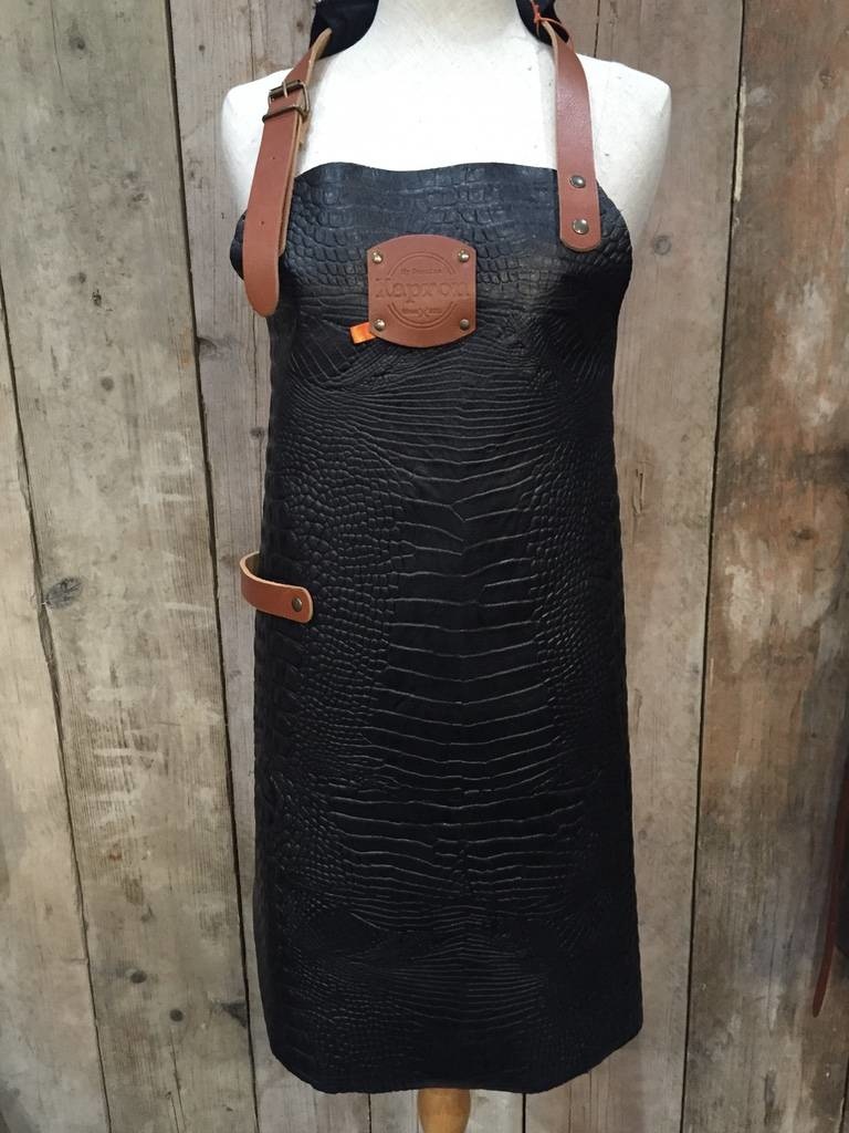 Le style crocodile est l’un des styles le plus beau dans notre collection. Le cuir de ce tablier a été imprimé avec une gravure crocodile et une finition avec des rubans en cuir tanné. Ce type de cuir est facile à nettoyer avec un torchon humide.