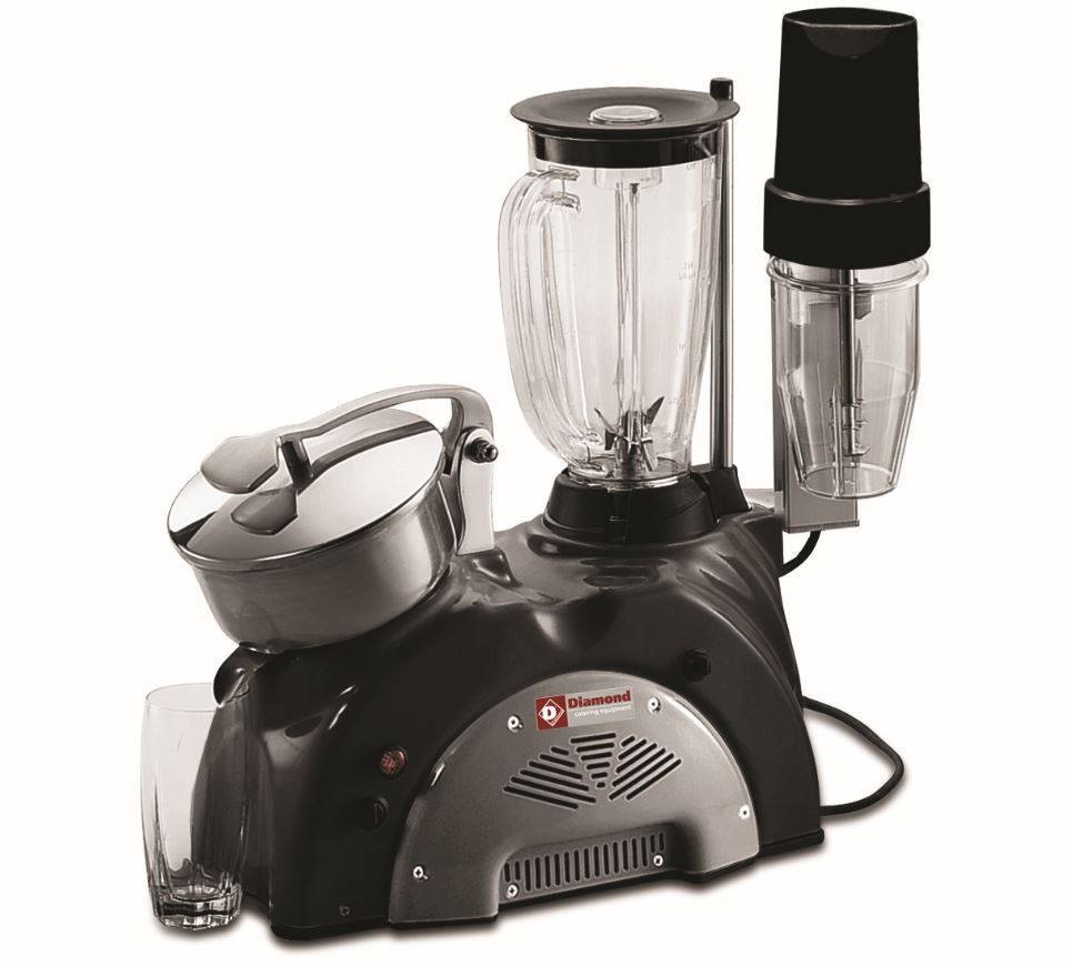 Appareil multifonctions combiné, avec les mêmes caractéristiques que: presse-agrumes P501/B, mixer T1/B et milk-shake F6S/B.Info: la réalisation sera de couleur noire, avec les aérations grises !!