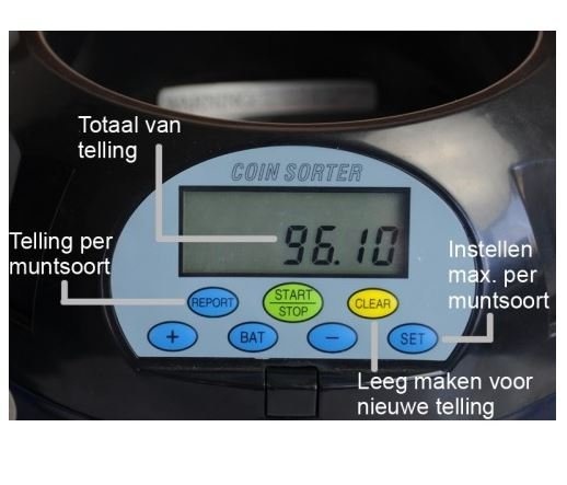- Dans l'emballage: machine à compter les pièces, plateaux à monnaie (8), cordon d'alimentation, kit d'entretien, manuel