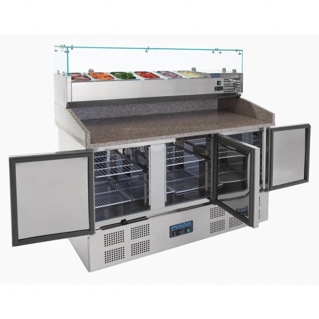 Comptoir de préparation avec plan de travail en marbre et zone gastronorme réfrigérée protégée par un écran. Idéal pour la préparation des pizzas, salades et sandwichs. Grande capacité de stockage. Le plan de travail en marbre reste froid donc évite que la pâte à pizza ne colle. Commande entièrement automatique avec affichage numérique constant et dégivrage automatique. Sans CFC. Non tropicalisé.
