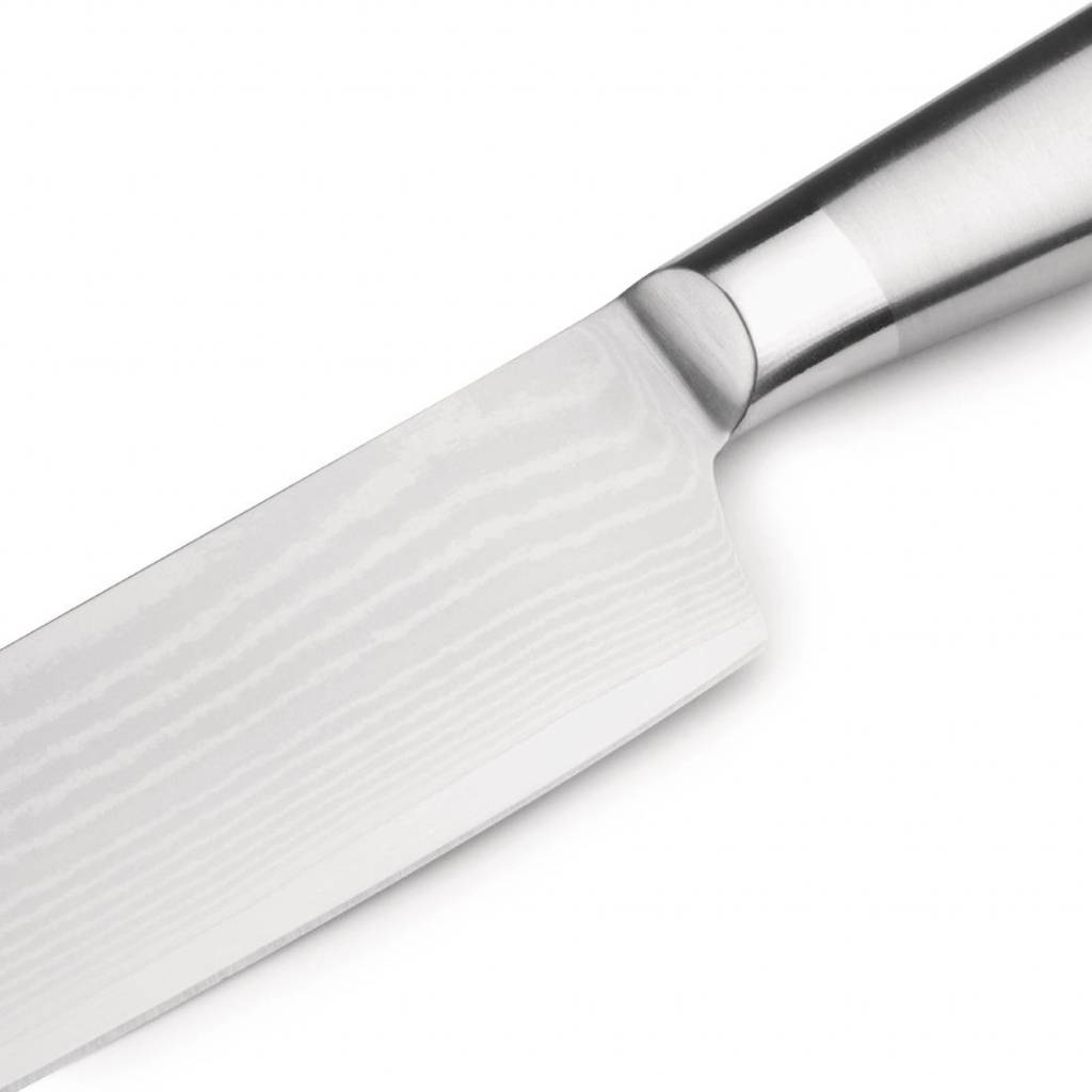 Ce couteau japonais Santoku VG-10 se caractérise par une base en acier inoxydable trempé indice Rockwell 60°, offrant une excellente qualité de coupe longue durée. Deux couches d'acier Damas recouvrent la base pour la protéger contre la corrosion. Le manche ergonomique en micarta offre une excellente adhérence.