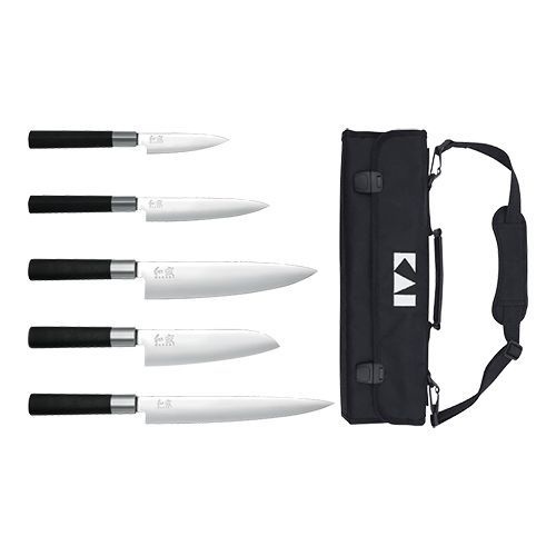 contenu: couteaux d'office 10cm, couteaux tranchelard 15cm, couteau de chef 20cm, couteau Santoku 16cm, couteau à viande 23cm, trousse à couteaux inclus