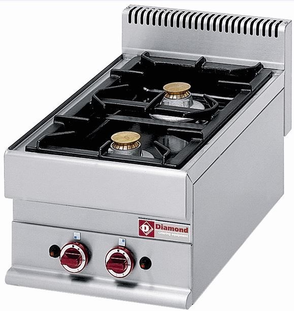2 brûleurs à feu vif (1x 3,6 kW et 1x 5 kW).Réalisation en acier inox 18/10 AISI 304.