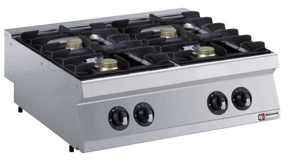 4 brûleurs (4x 5,5 kW).Réalisation en acier inox AISI 304, "Top" embouti (15/10ème) avec cuvette de récolte liquide étanche, pieds réglables en inox (150/200 mm).