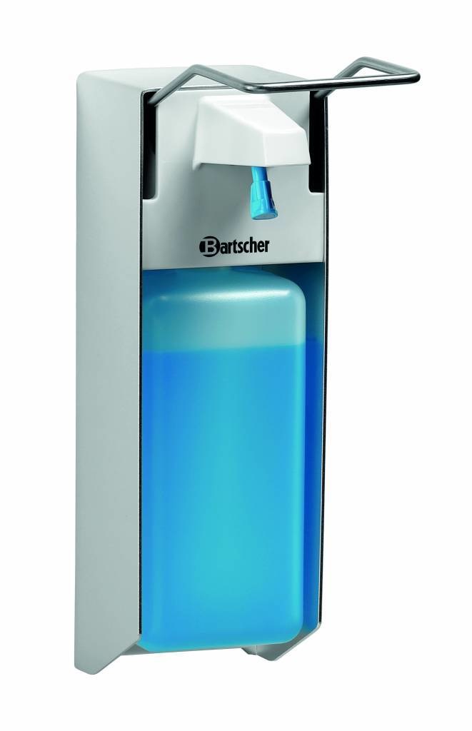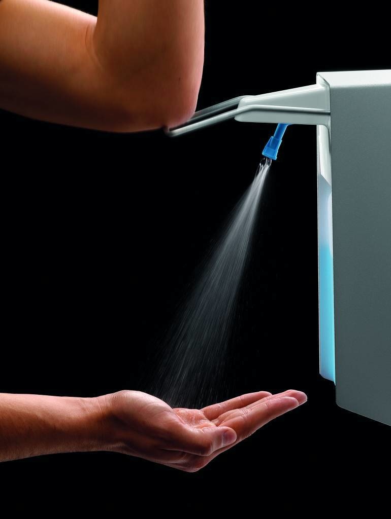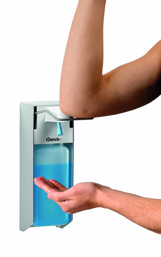 Désinfection rapide et facile des mains pour un maximum de protection. Que ce soit dans les cuisines, les laboratoires ou dans les bâtiments publics – Avec le système de pompe sans cartouche, le distributeur qui s'actionne avec le coude permet des conditions d'hygiène optimales.