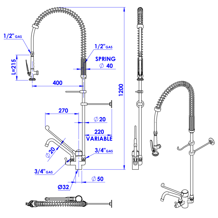 Douche de Pré-Rinçage Monobloc | Avec Grue Pivotante Contrôle des Coudes | 1200mm