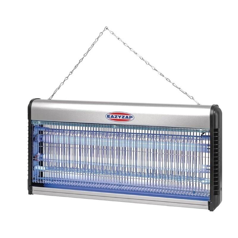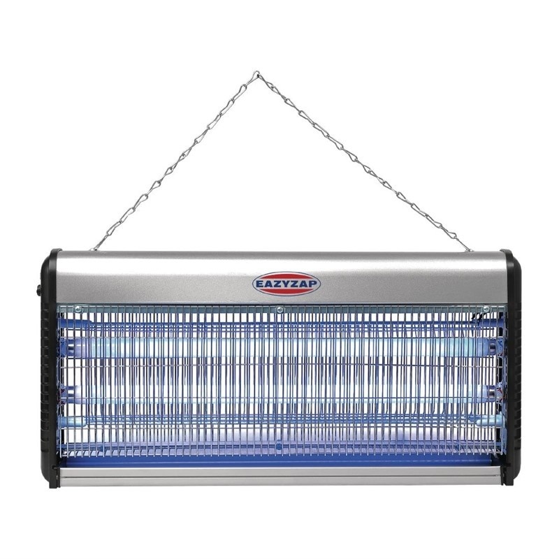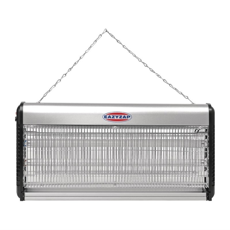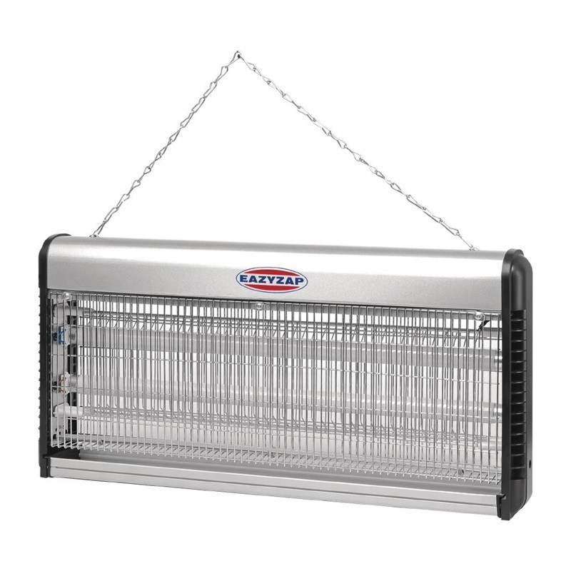 Désinsectiseur professionnes de haute qualité, équipé d'un solide châssis métallique et de tubes UV haute visibilité pour attirer les insectes volants. Chaînette de fixation au plafond fournie. Tubes de rechange vendus séparément (P153).