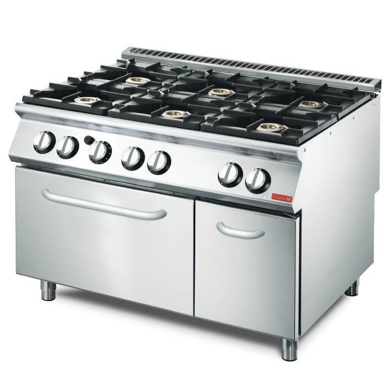 Fourneau gaz 70/120CFG Gastro M 6 feux sur four gaz, avec thermocouples, brûleurs cuivre, plaques de débordement émaillées et allumage automatique. Four avec thermostat, allumage piezo, flamme pilote et rails amovibles. Dimensions internes du four : 530x530x280(h)mm. Gaz naturel. Pieds réglables.