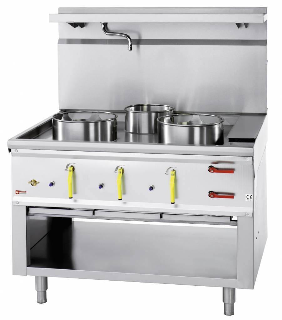 Brûleurs type wok 2x Ø 290 mm 23.82 kW & 1x Ø 230 mm 11.25 kW.