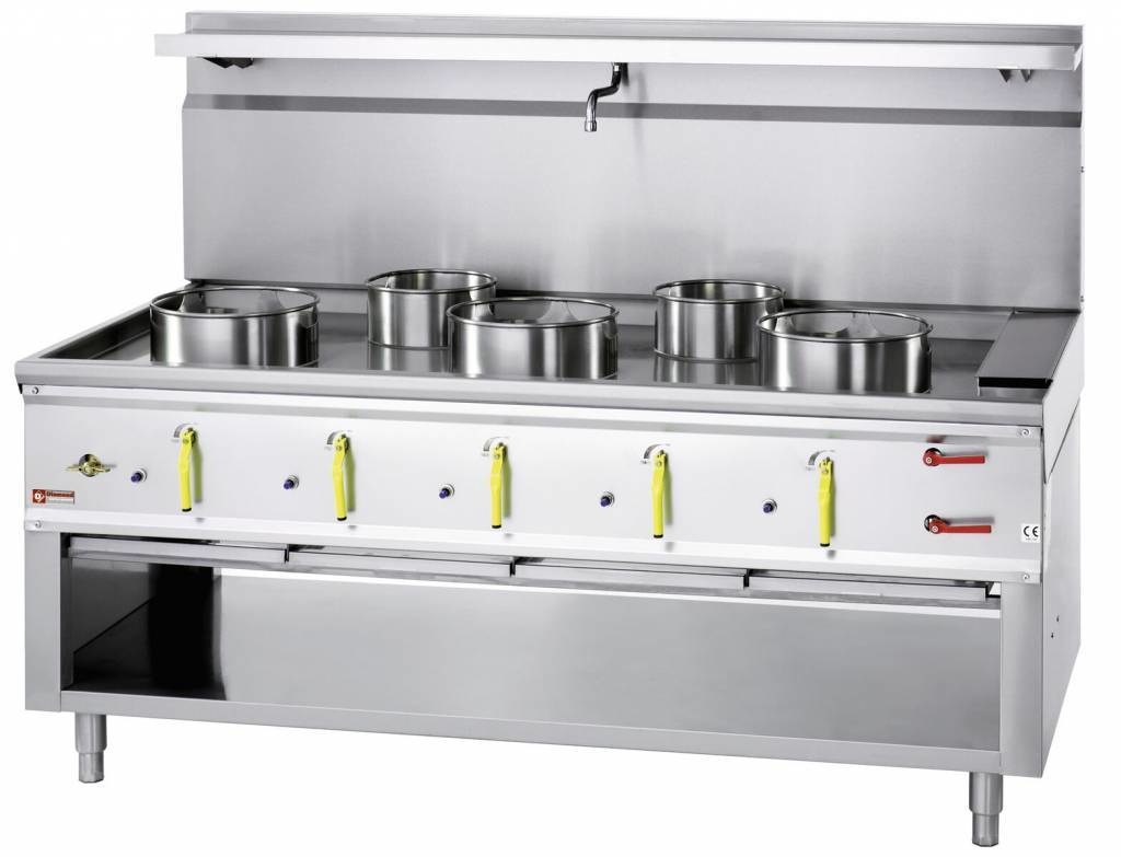 Fourneau wok 5 brûleurs avec rideau d'eau | 3 x 23kW + 2 x 11kW