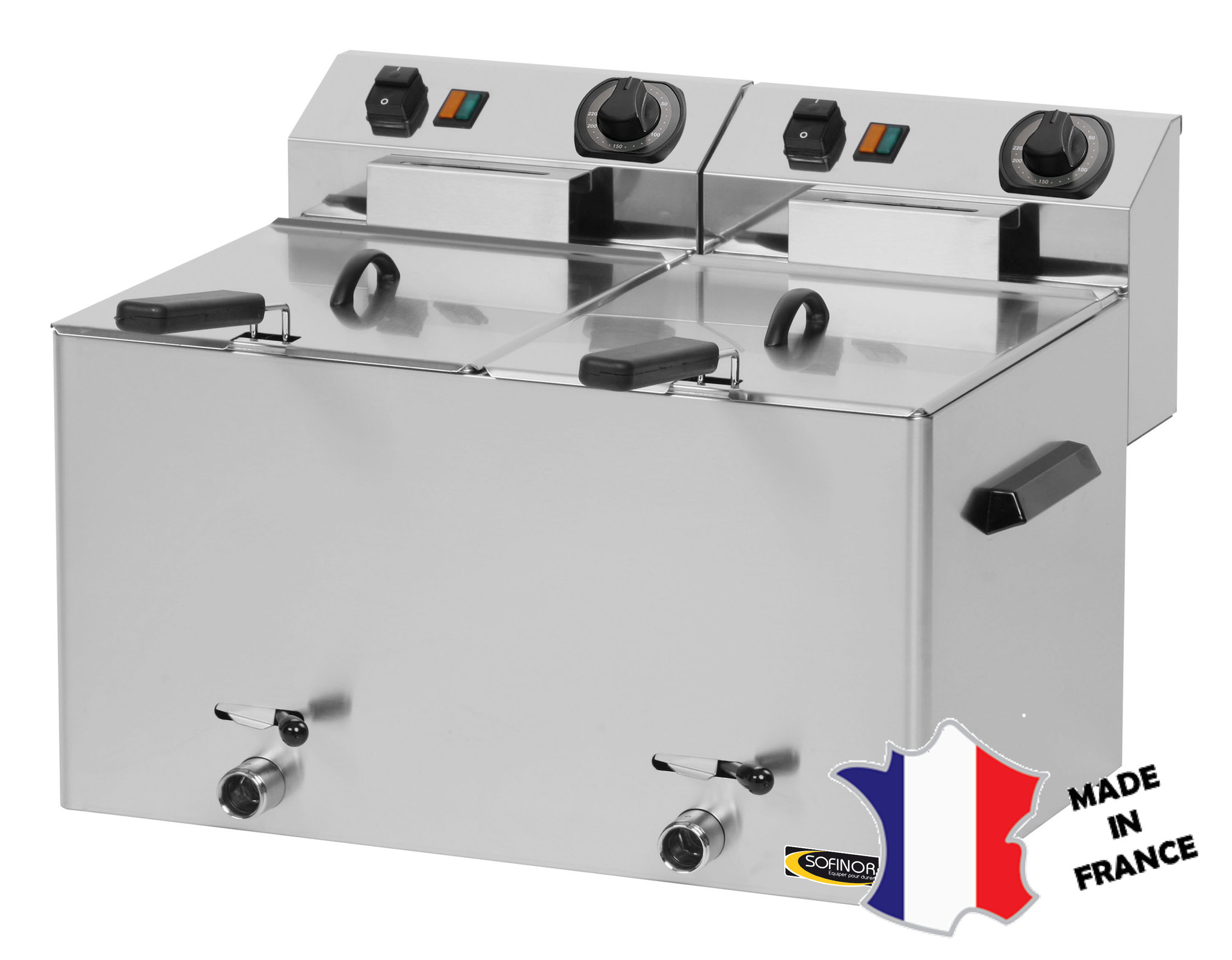 FRITEUSE ELECTRIQUE 2 X 8 LITRES AVEC ROBINET DE VIDANGE 2 x 3.4kW. Structure inox . Zone froide . Boîtier de commande amovible indépendant.