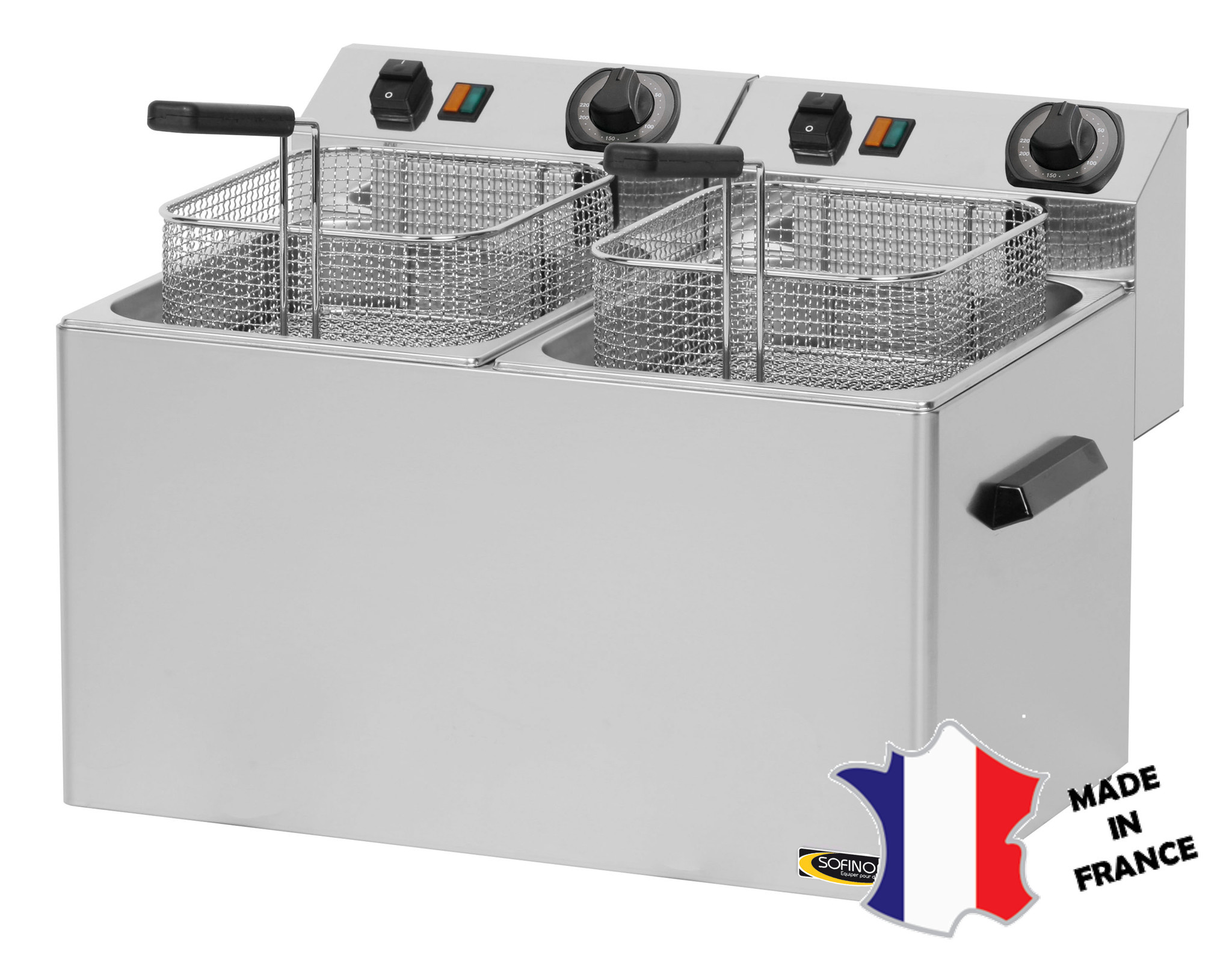 FRITEUSE ELECTRIQUE 2 X 8 LITRES 2 x 3.4kW. Structure inox . Zone froide . Boîtier de commande amovible indépendant. Thermostat de 50 à 190°C.