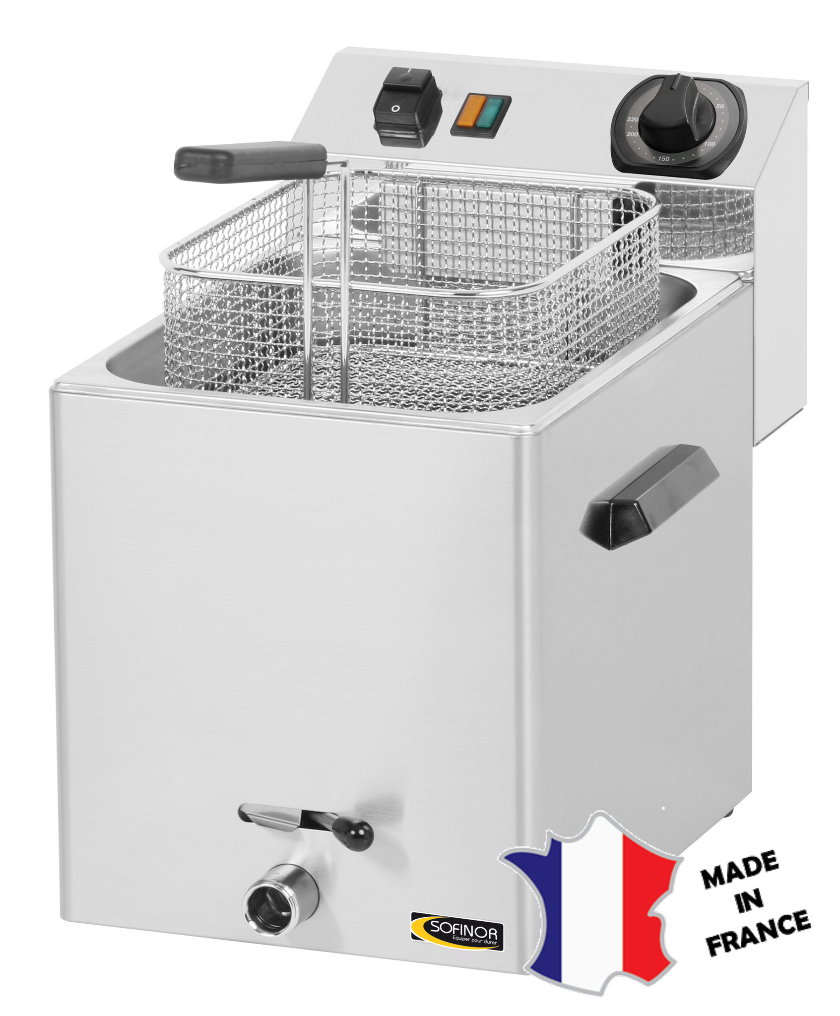 FRITEUSE ELECTRIQUE 8 LITRES 3.4kW. Structure inox . Zone froide . Boîtier de commande amovible indépendant. Thermostat de 50 à 190°C.