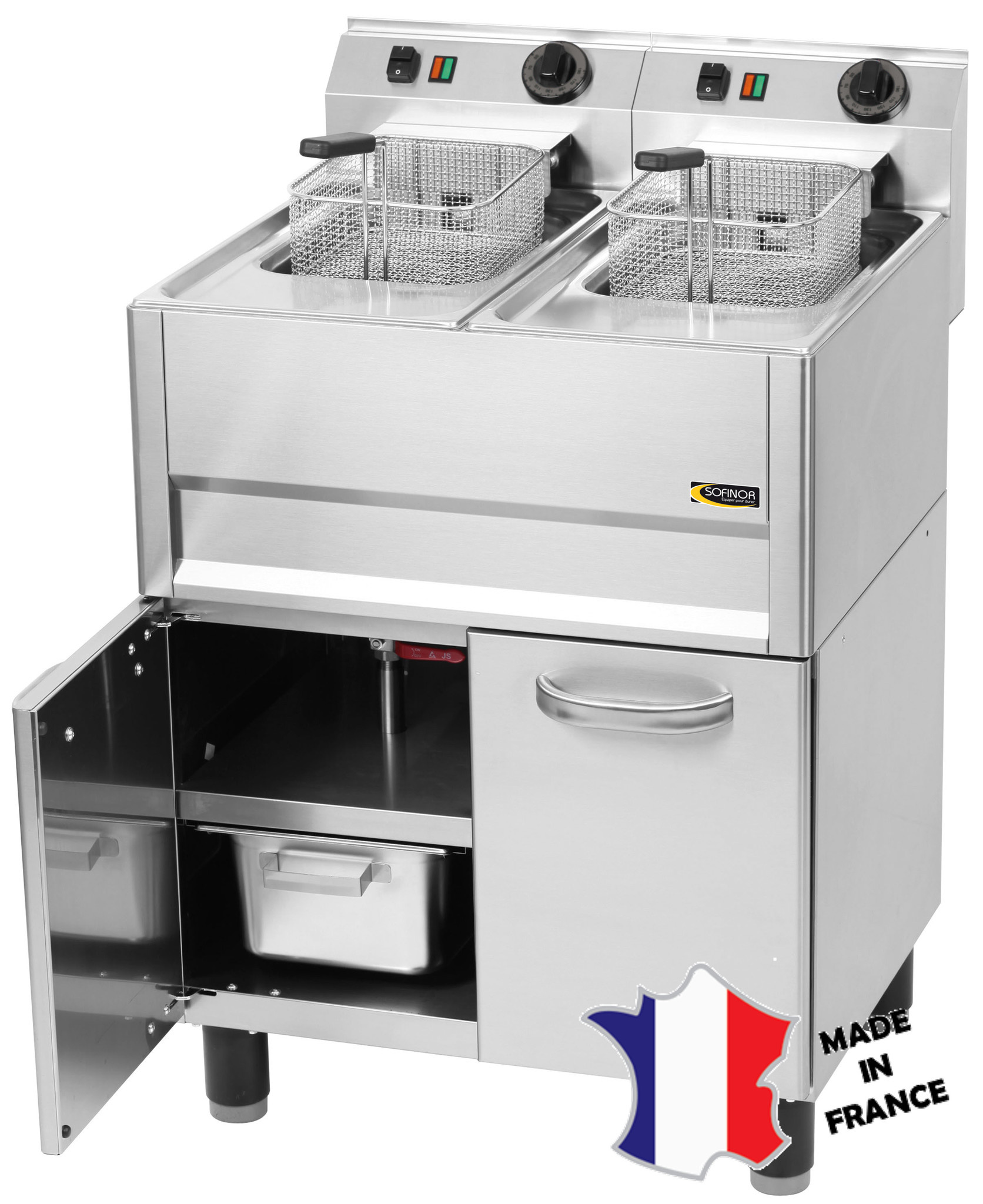 FRITEUSE ELECTRIQUE 2 x13 LITRES SUR MEUBLE 2 PORTES 2x9.8kW. Structure inox . Zone froide . Boîtier de commande amovible indépendant. Thermostat de 50 à 190°C.