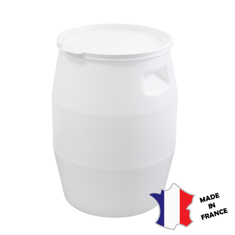 Fût plastique certifié contact alimentaire.