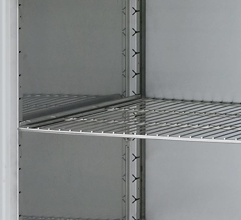- Equipements en standard : Porte standard à gauche ou à droite, avec serrure, porte à fermeture automatique, ouvre-porte à pédale, 5 étagères grillagées en inox