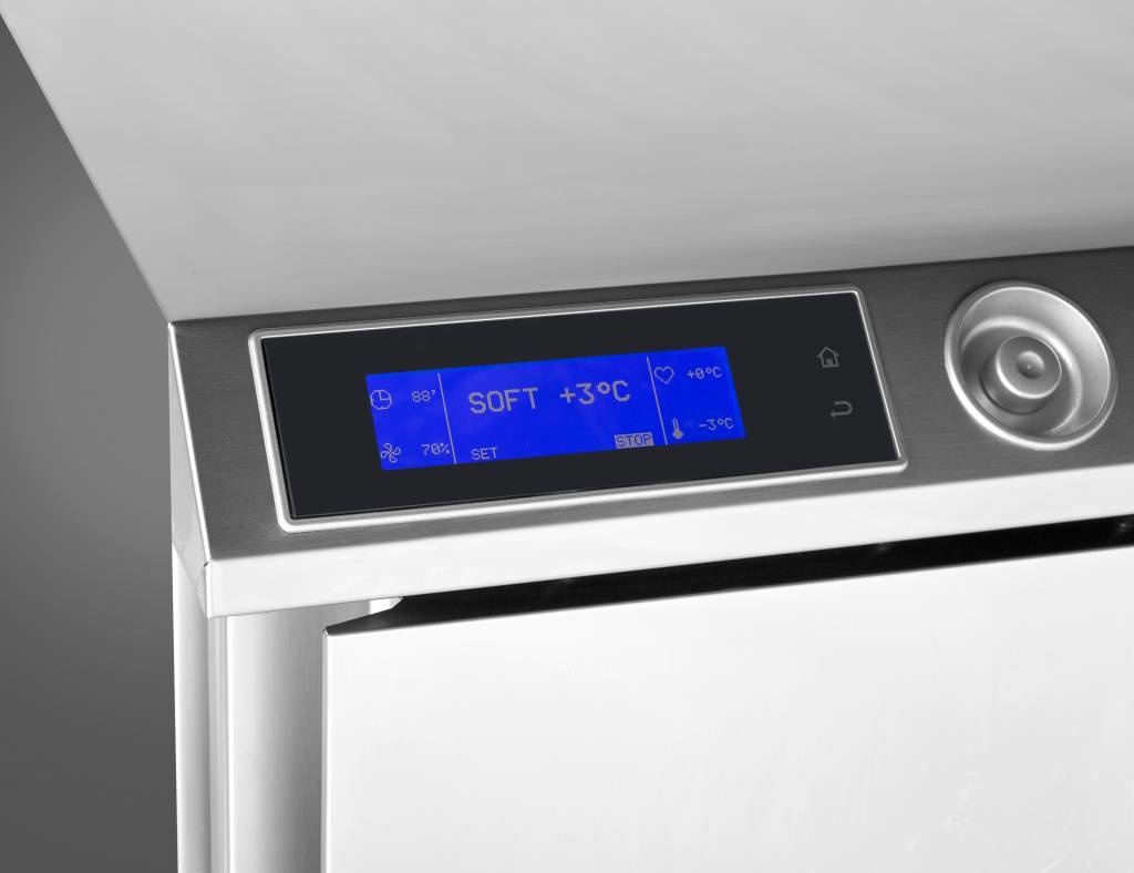 Porte ferrée à droite avec un rappel de fermeture de porte. 5 niveaux compatibles GN 1/1 ou Euronorme 600x400. Sonde multipoints avec 3 points de mesures, alarm HACCP, système de commande LCD + codeur à la navigation
