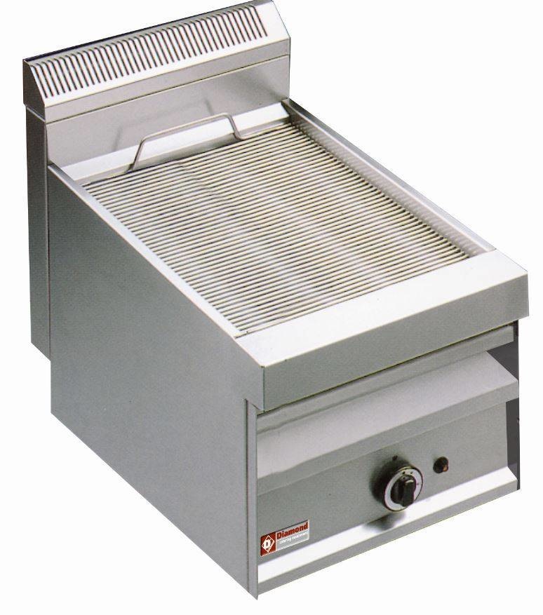 Grille de cuisson inox (380x470 mm).Chauffage par brûleurs en acier inox à flamme stabilisée, placé en dessous de calottes en acier inox "spéciale" qui ainsi transmettent la chaleur par rayonnement, cette caractéristique unique de construction a la faculté de garantir que la flamme vive ne soit jamais en contact avec les aliments.