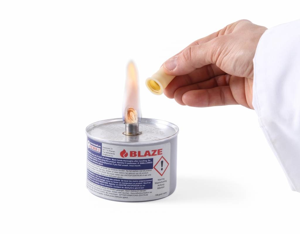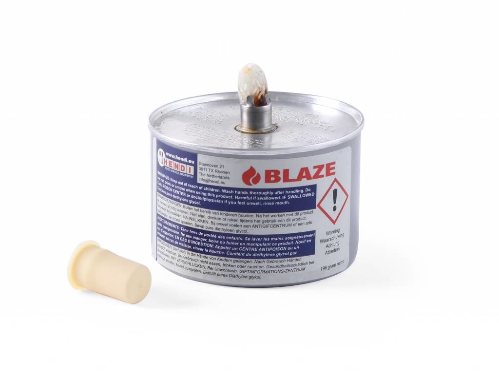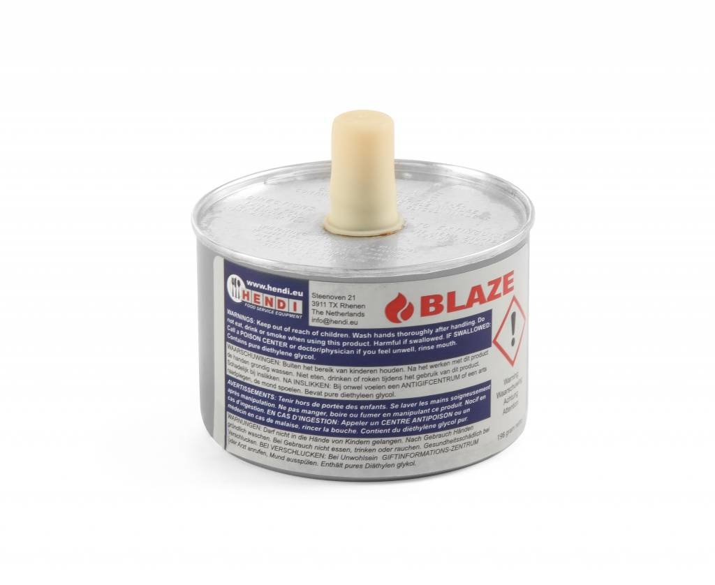 Hendi vend ce liquide dans des boîtes métalliques fermées non-rechargeable de 145 et 200 g et livres également une boîte en aluminium de 198 g sous le marque Blaze. La mèche ajustable en hauteur peut régler l’intensité de la flamme.