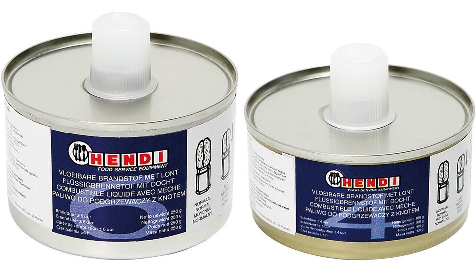 Hendi vend ce liquide dans des boîtes métalliques fermées non-rechargeable de 145 et 200 g et livres également une boîte en aluminium de 198 g sous le marque Blaze. La mèche ajustable en hauteur peut régler l’intensité de la flamme.