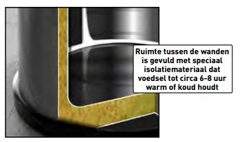 - Grâce au matériel isolant entre les parois, les aliments restent chaud ou froid pendant 6 – 8 heures