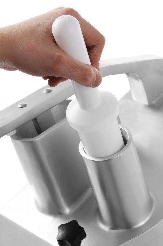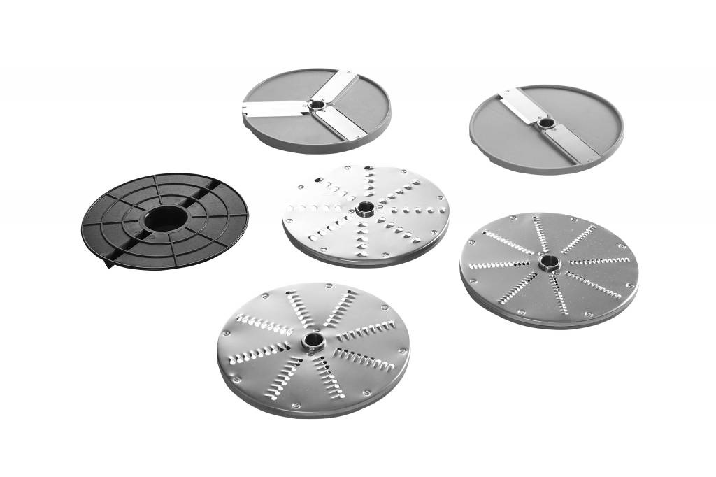 Avec 5 couteaux inclus pour divers résultats de coupe: 2 disques à trancher de 2 et 4 mm et 3 disques à râper de 3,5 et 7 mm
