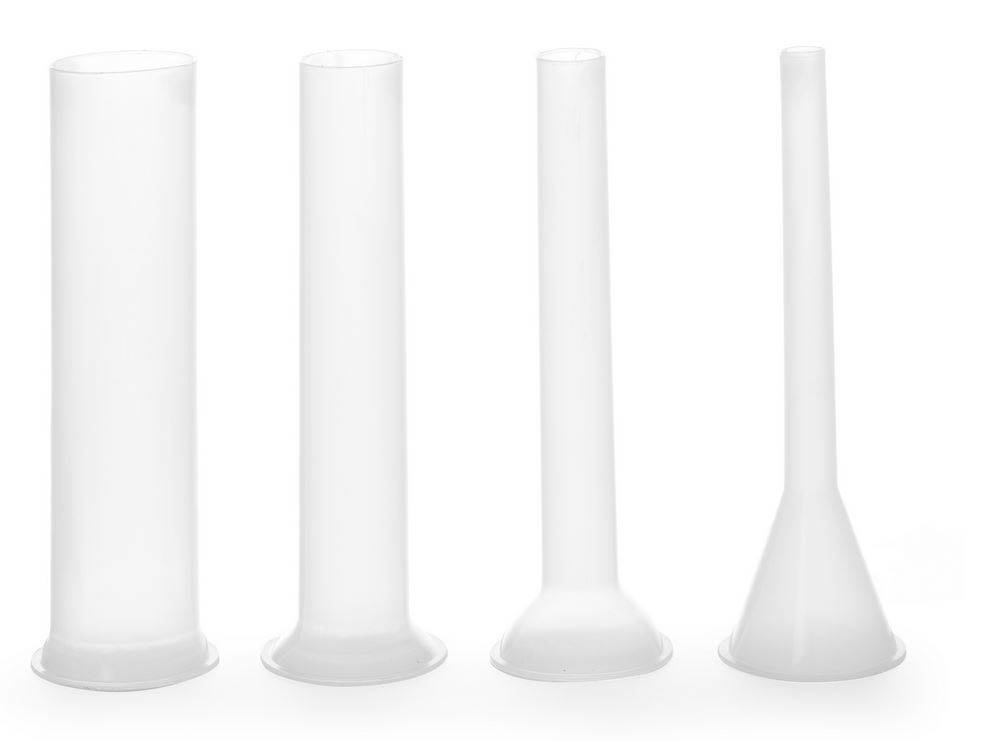 Avec un set de quatre entonnoirs en plastique, diamètres: 10/20/30/40 mm