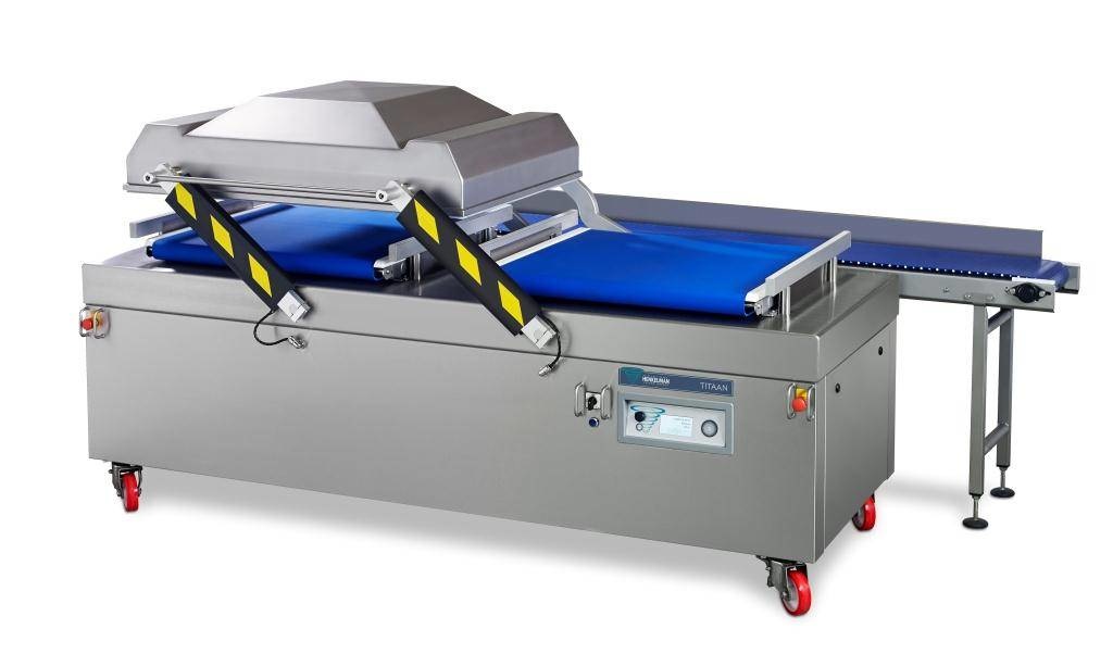 La seule machine complètement automatique dans la gamme d’Henkelman, avec un couvercle et un convoyeur d'évacuation entièrement automatiques.Le Titaan est caractérisé par une construction robuste garantissant une durée de vie longue et une utilisation efficace, avec des résultats d'emballage optimaux.