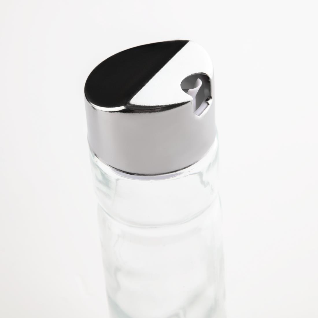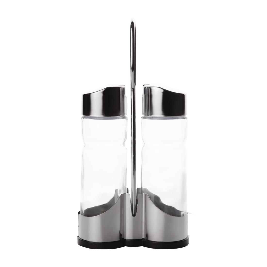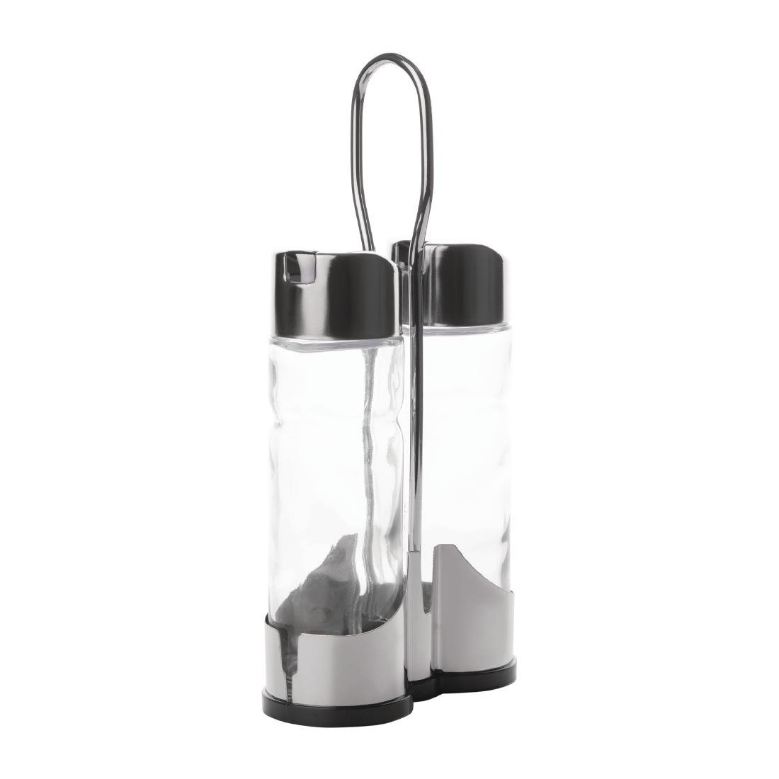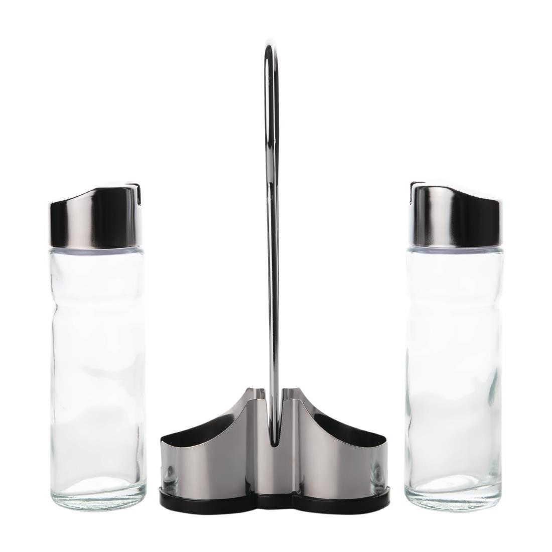 Ménagère 2 pièces, support en acier inoxydable avec base en plastique noir. Huilier et vinaigrier en verre avec couvercles en acier inoxydable.